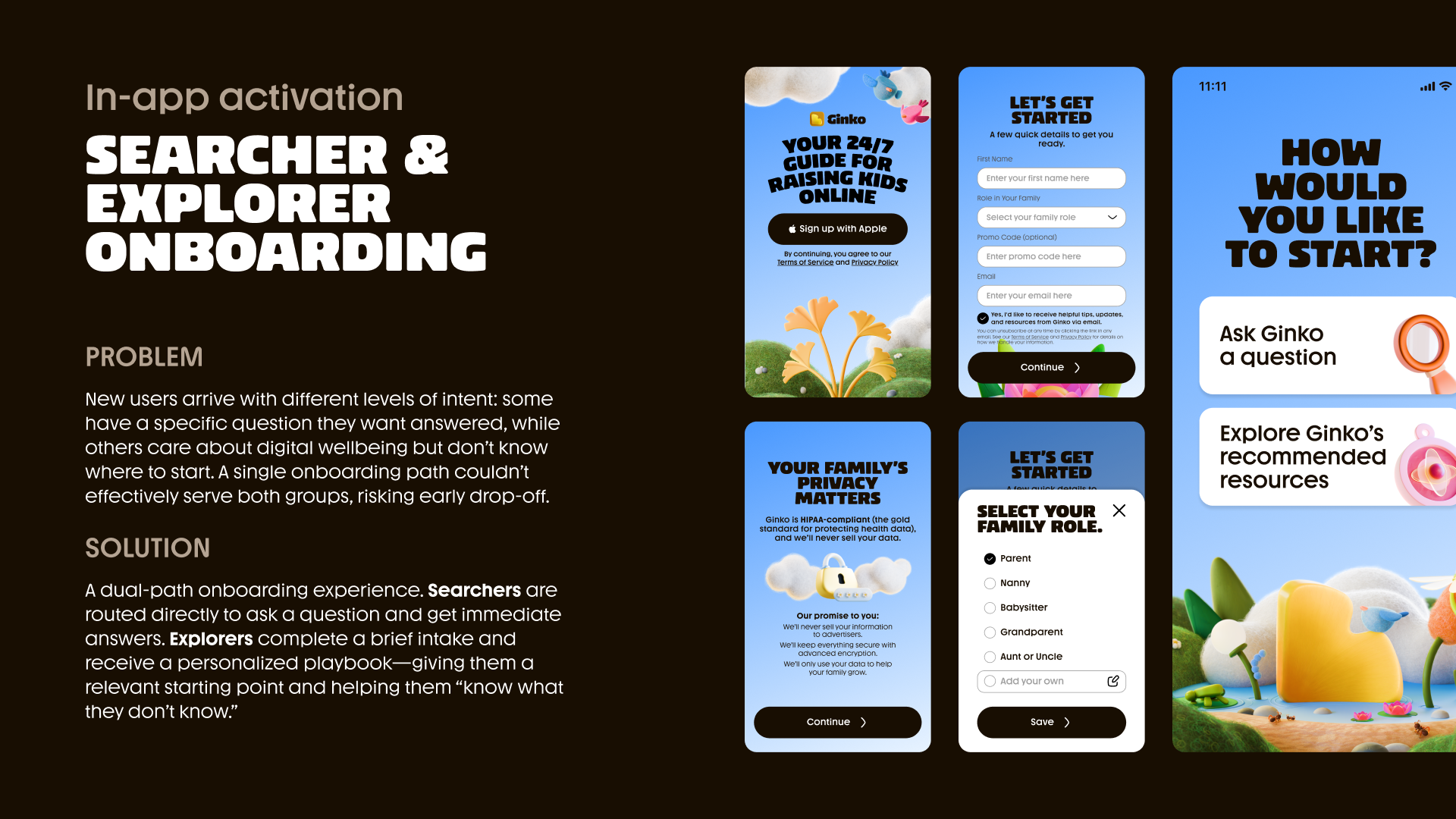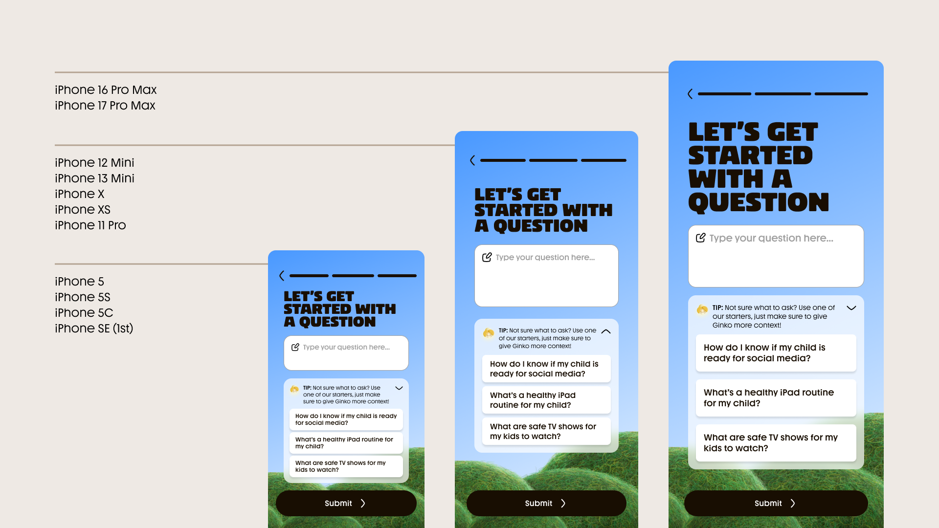 Given the range of iPhone screen sizes, I designed three mobile breakpoints to preserve layout clarity, manage content density, and minimize unnecessary scrolling, particularly during onboarding where early engagement and retention were critical.