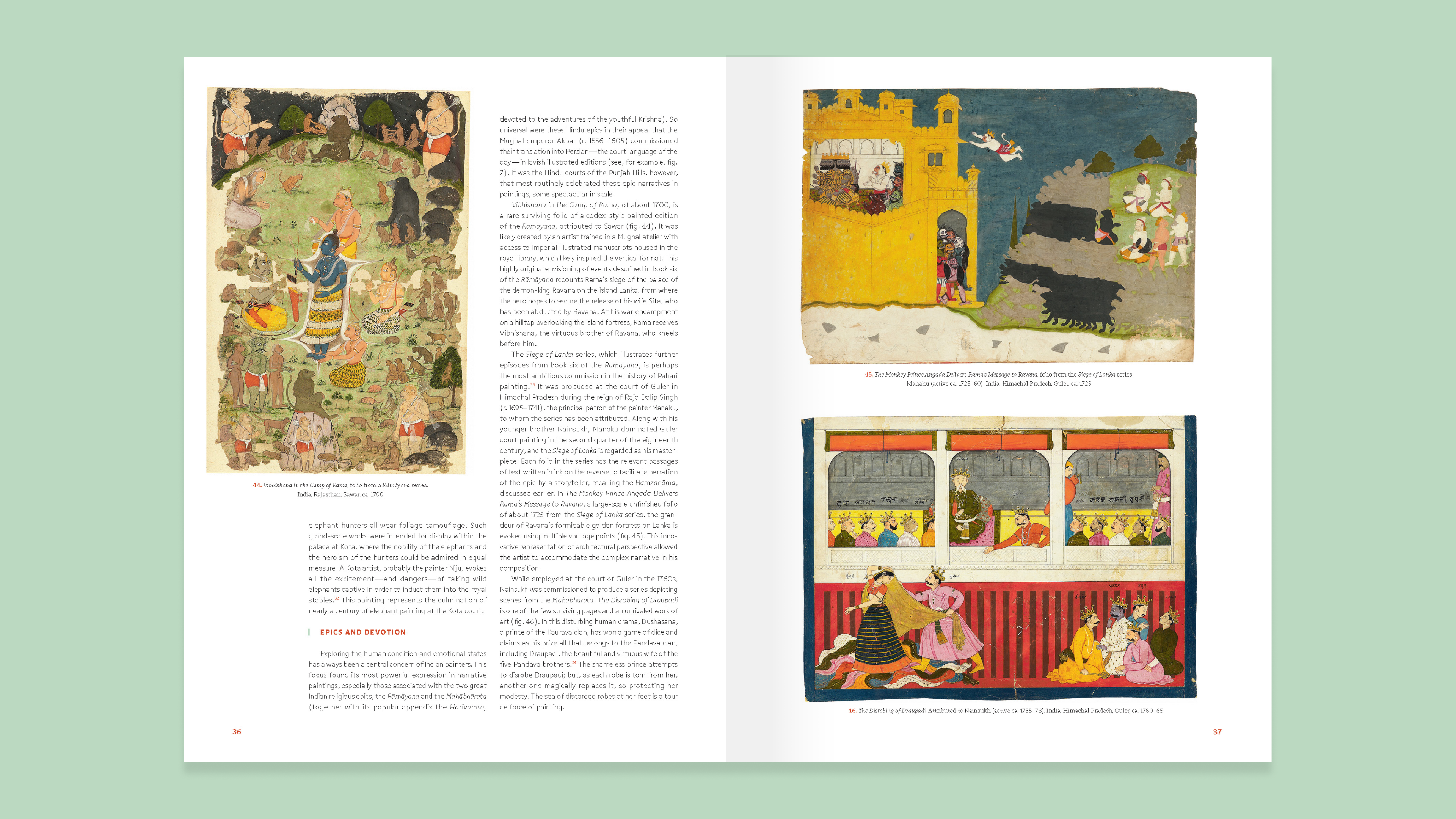 Howard Hodgkin’s collection of Indian court paintings comprise of Mughal-era miniatures that depict the lush sceneries and architecture of that time. We pulled from these paintings to build the color palette and the foundational layout grid.